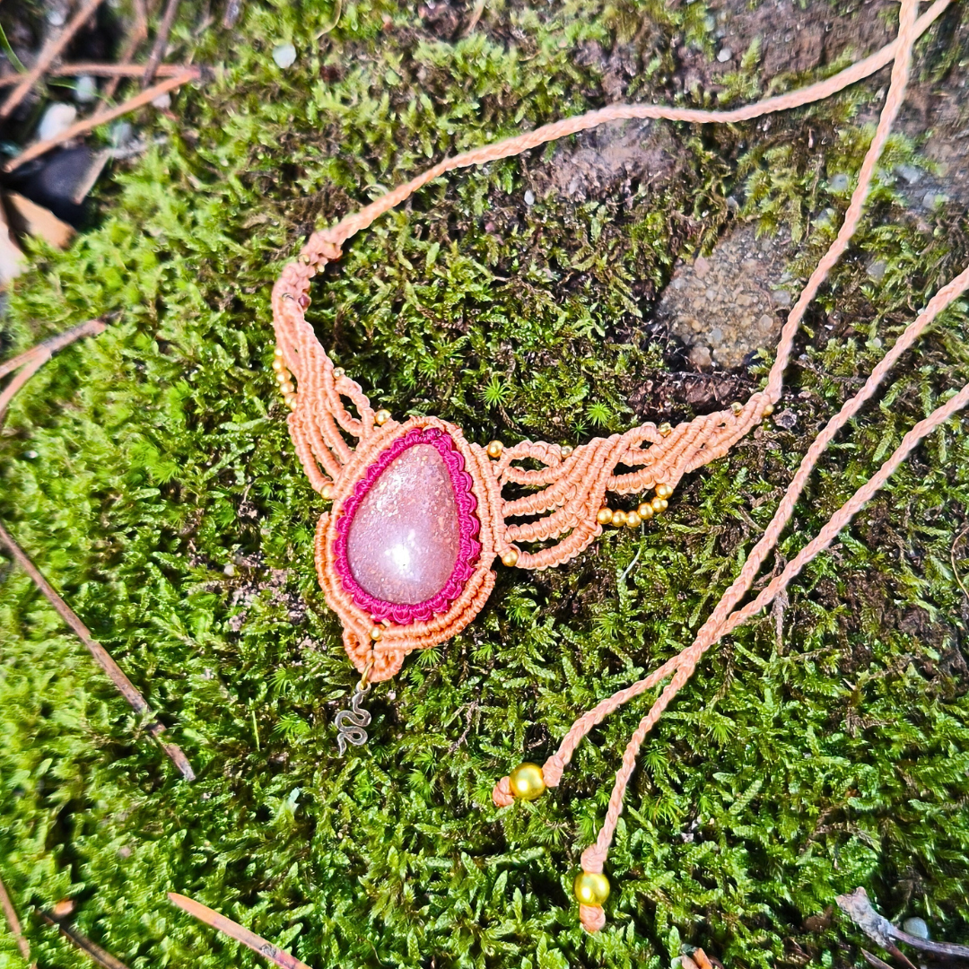 Este colar é uma criação única, feita à mão em micromacramé, que celebra o poder do feminino em todas as suas dimensões.