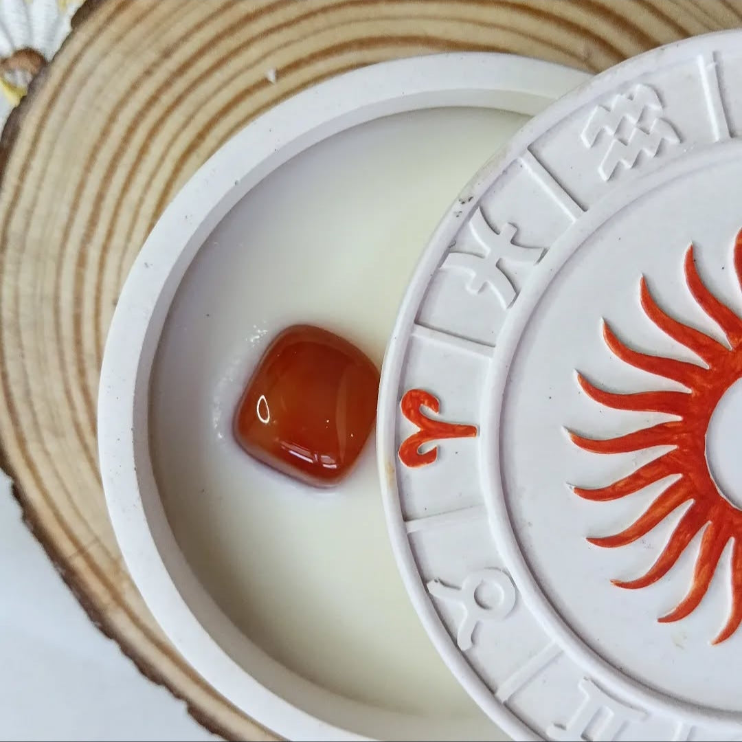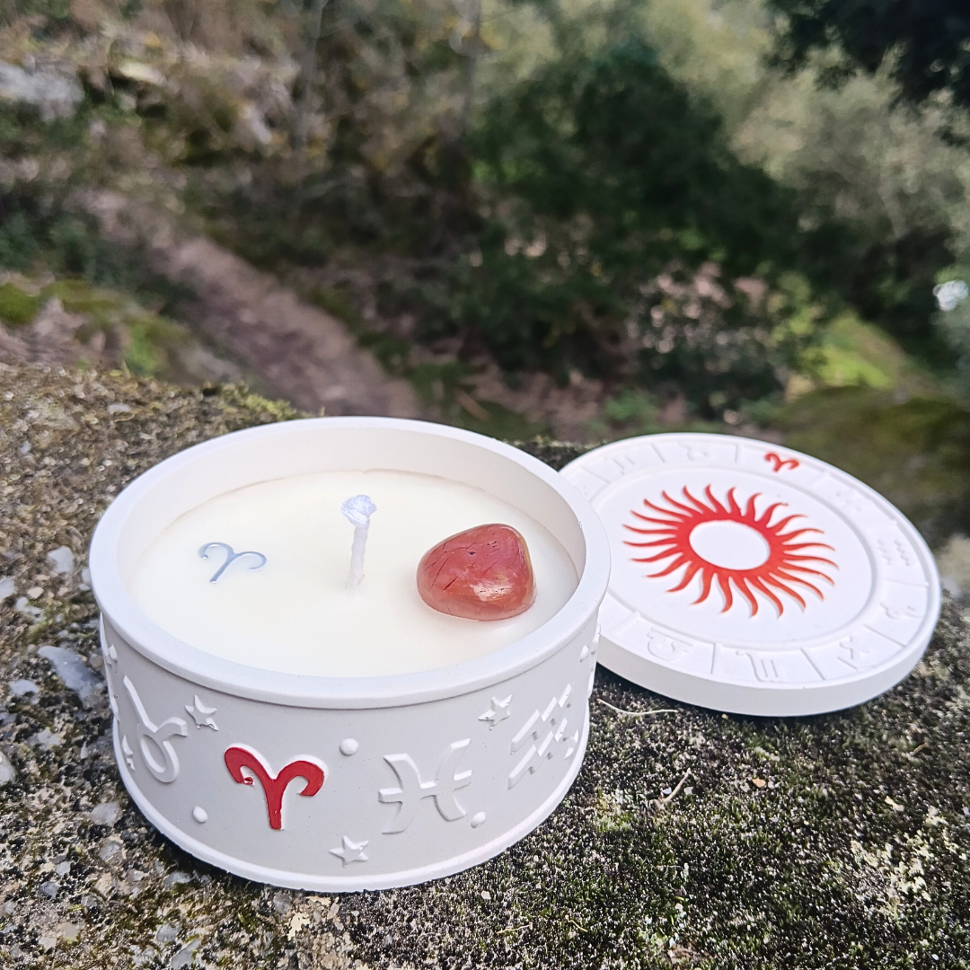 Carneiro - Cornalina- Vela com cerca de 100g de cera de soja, em peça de gesso cerâmico com 8,5cm de diâmetro e 4cm de altura (excluindo a tampa);