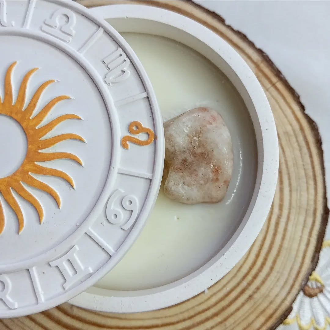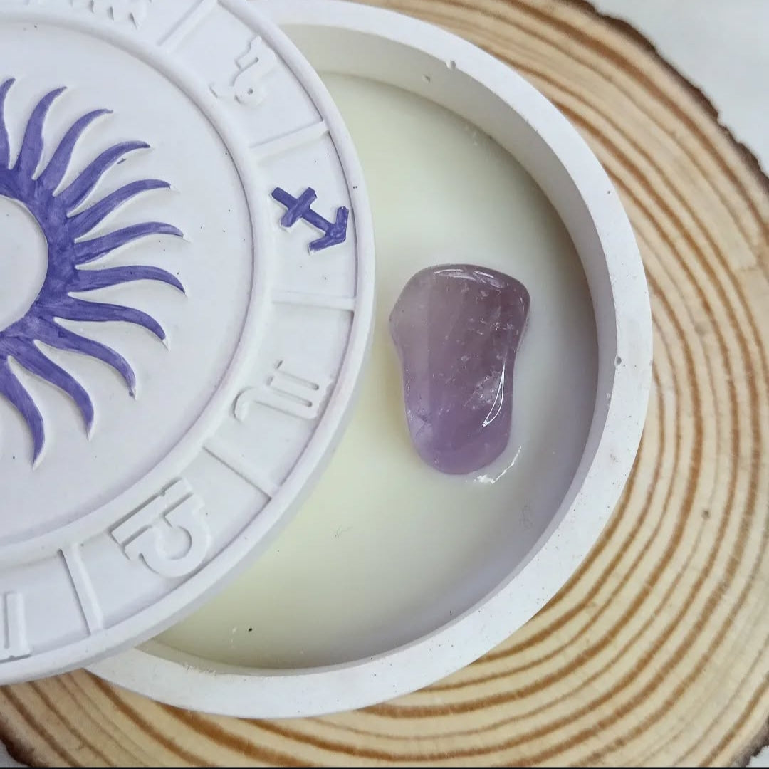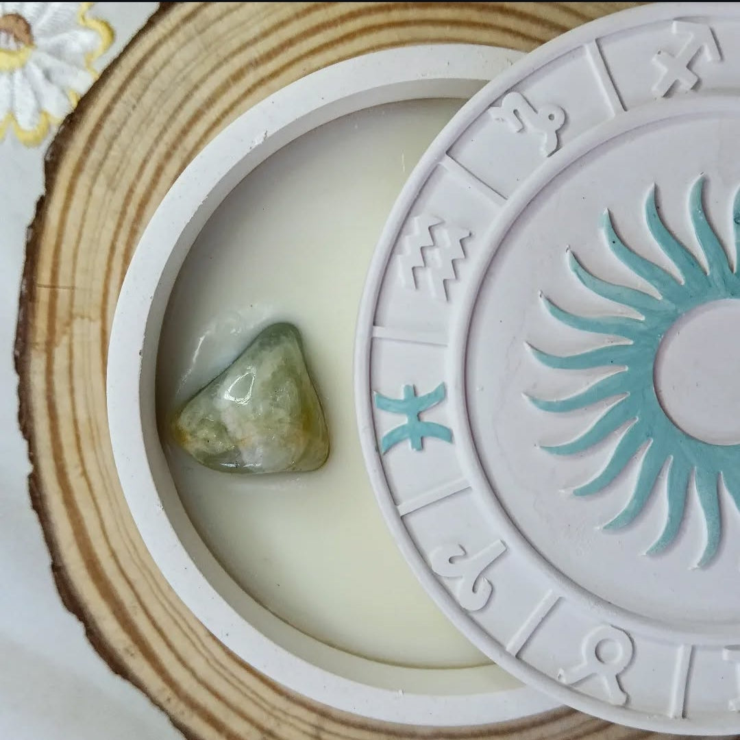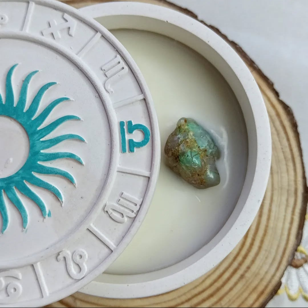 Em recipiente de gesso cerâmico com símbolos astrológicos e detalhes pintados à mão, estas velas são feitas com cera de soja e óleos essenciais. Guardam, no interior, uma mensagem secreta - um mantra -, única para cada signo.