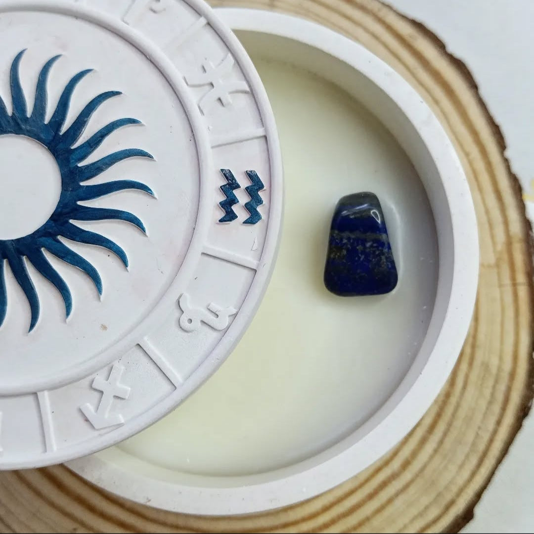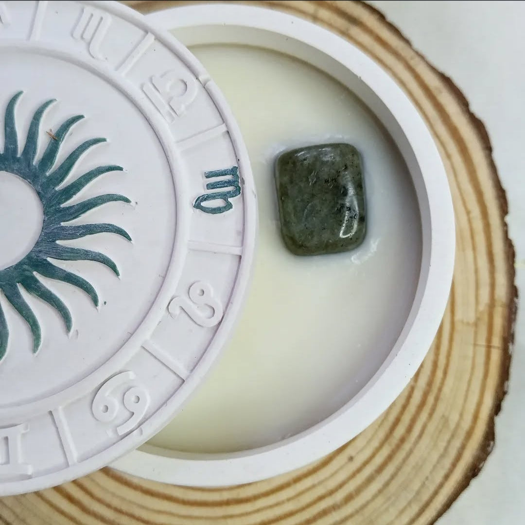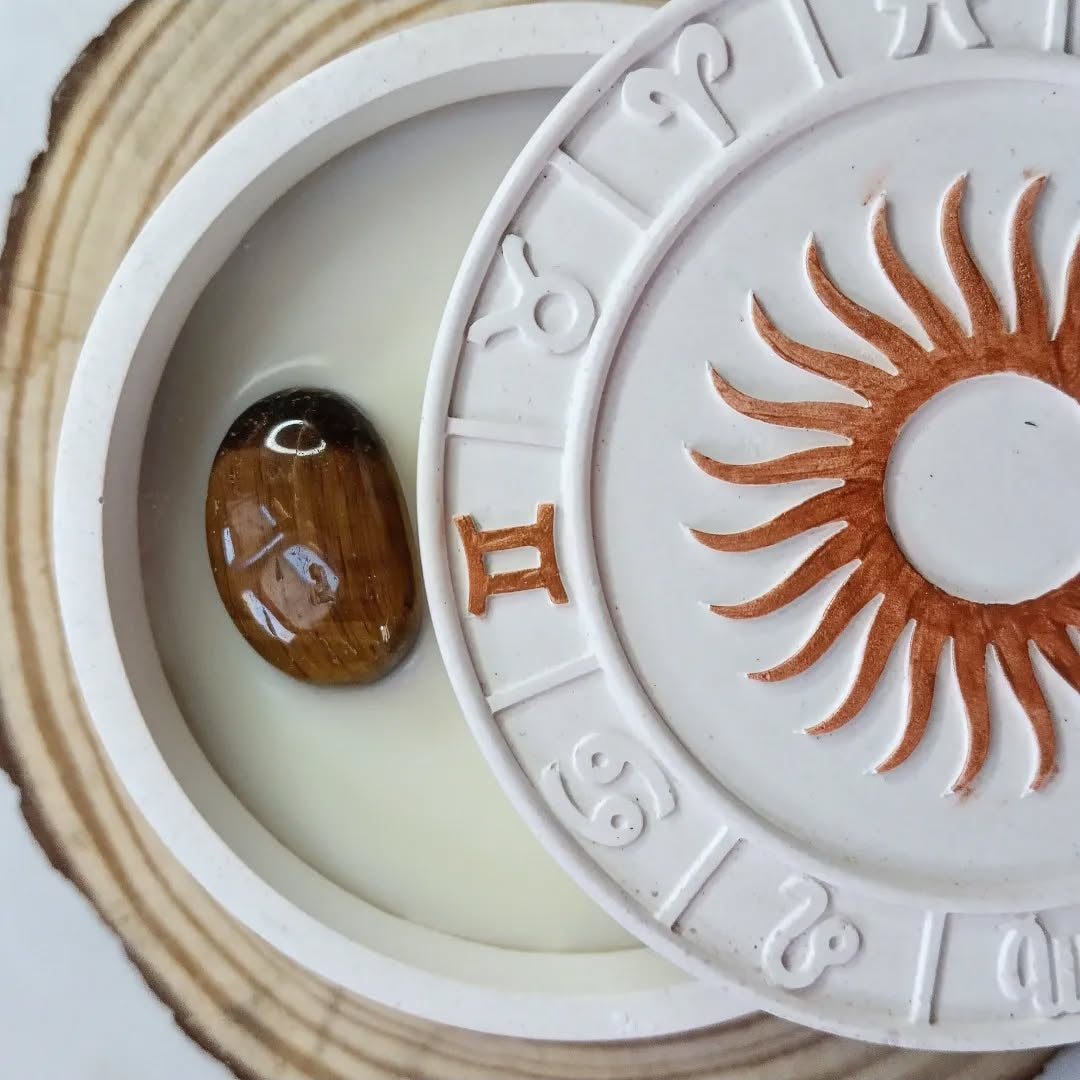 Em recipiente de gesso cerâmico com símbolos astrológicos e detalhes pintados à mão, estas velas são feitas com cera de soja e óleos essenciais. Guardam, no interior, uma mensagem secreta - um mantra -, única para cada signo.