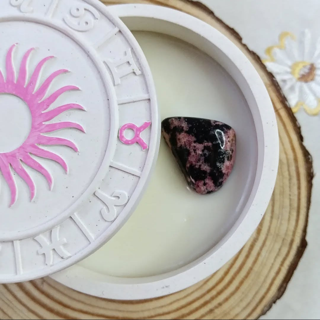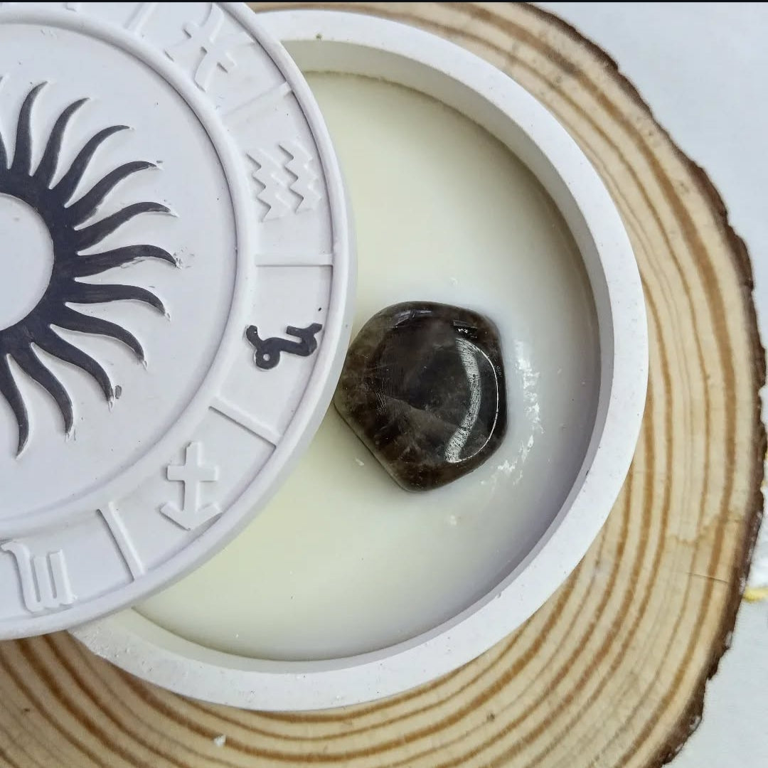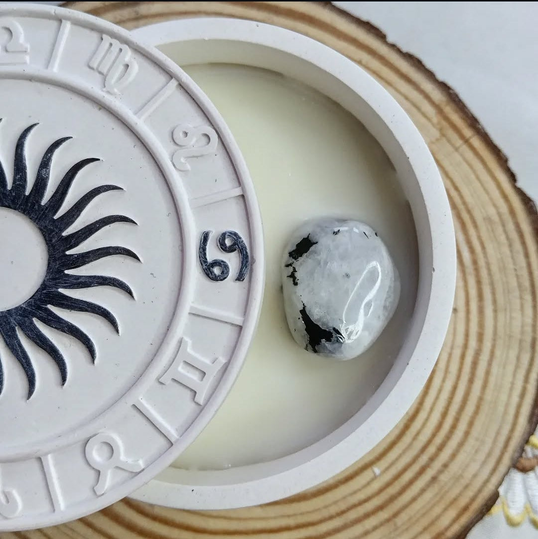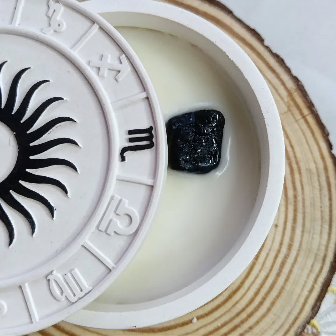 Em recipiente de gesso cerâmico com símbolos astrológicos e detalhes pintados à mão, estas velas são feitas com cera de soja e óleos essenciais. Guardam, no interior, uma mensagem secreta - um mantra -, única para cada signo.