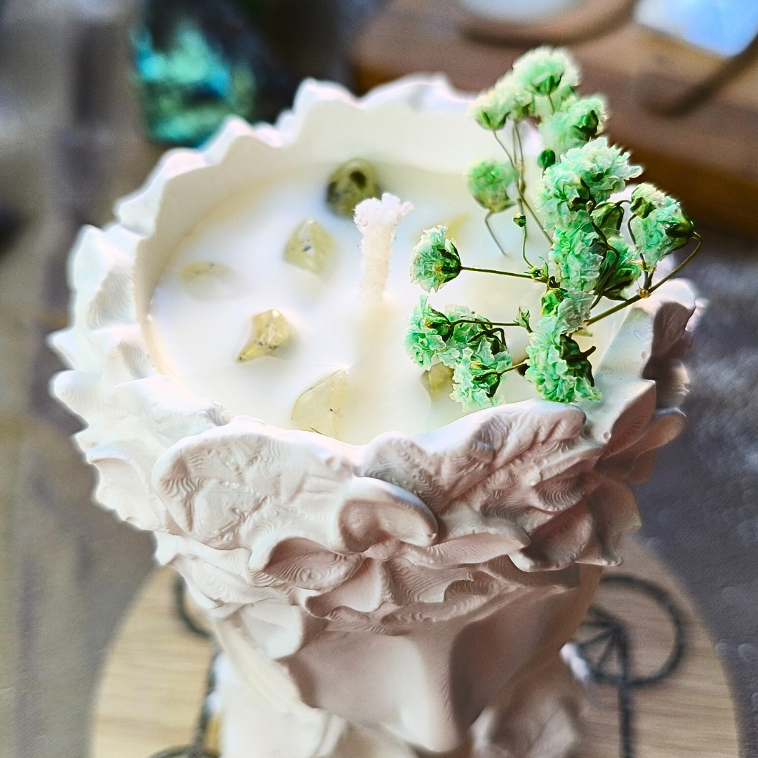 A prehnite é um cristal que emana uma energia serena e curativa. Originária principalmente da África do Sul, é conhecida pela sua coloração verde pálida com pequenas inclusões negras e translúcidas. Ao incorporar a prehnite na decoração das velas, adicionamos uma sensação de tranquilidade e renovação ao ambiente. Acredita-se que a prehnite promove a cura emocional e o crescimento espiritual, tornando-a perfeita para espaços onde se busca promover a calma e a introspeção.