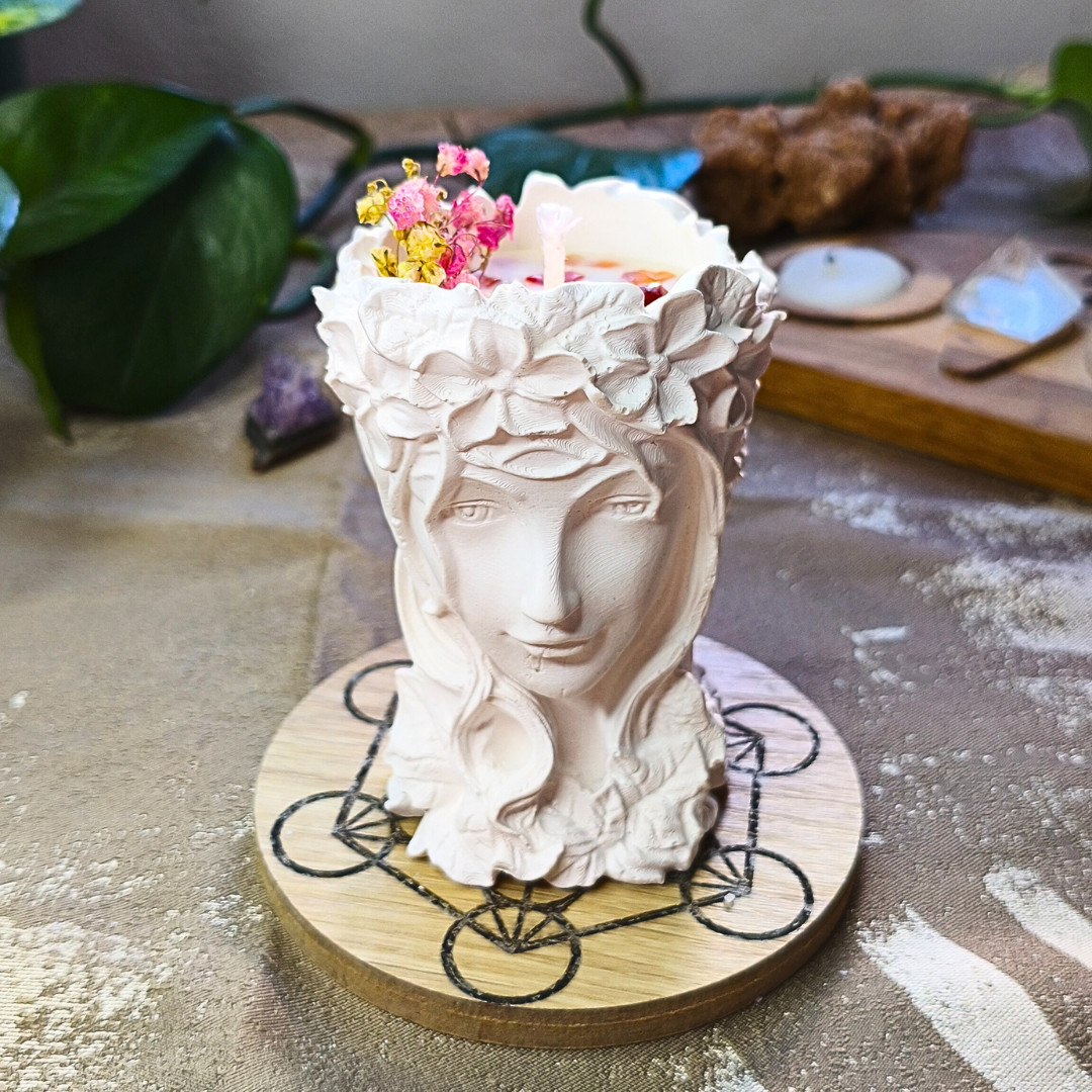 - Vela com cerca de 50g de cera de soja, em peça de gesso cerâmico com 7cm de diâmetro e 10cm de altura;