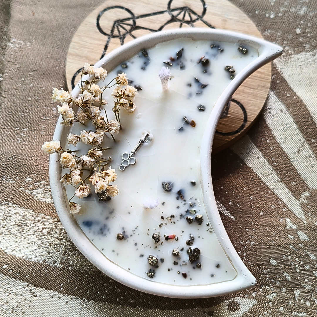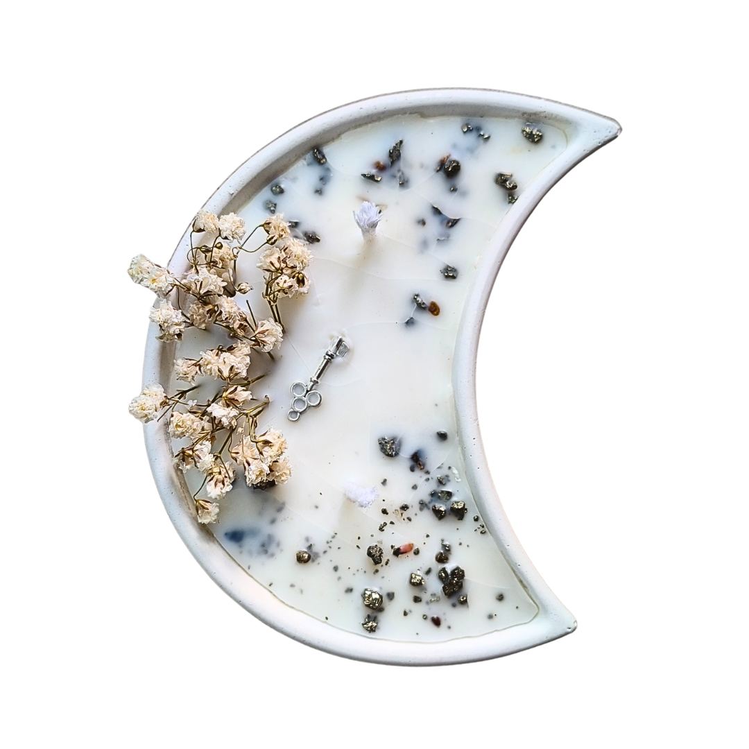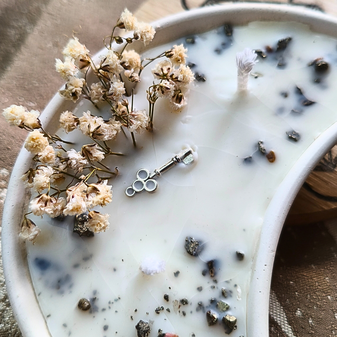 Vela All-Ki-Mística® com Óleo Essencial de Hortelã Pimenta em Lua com cristais Pirite