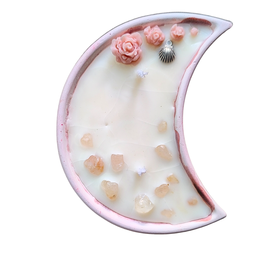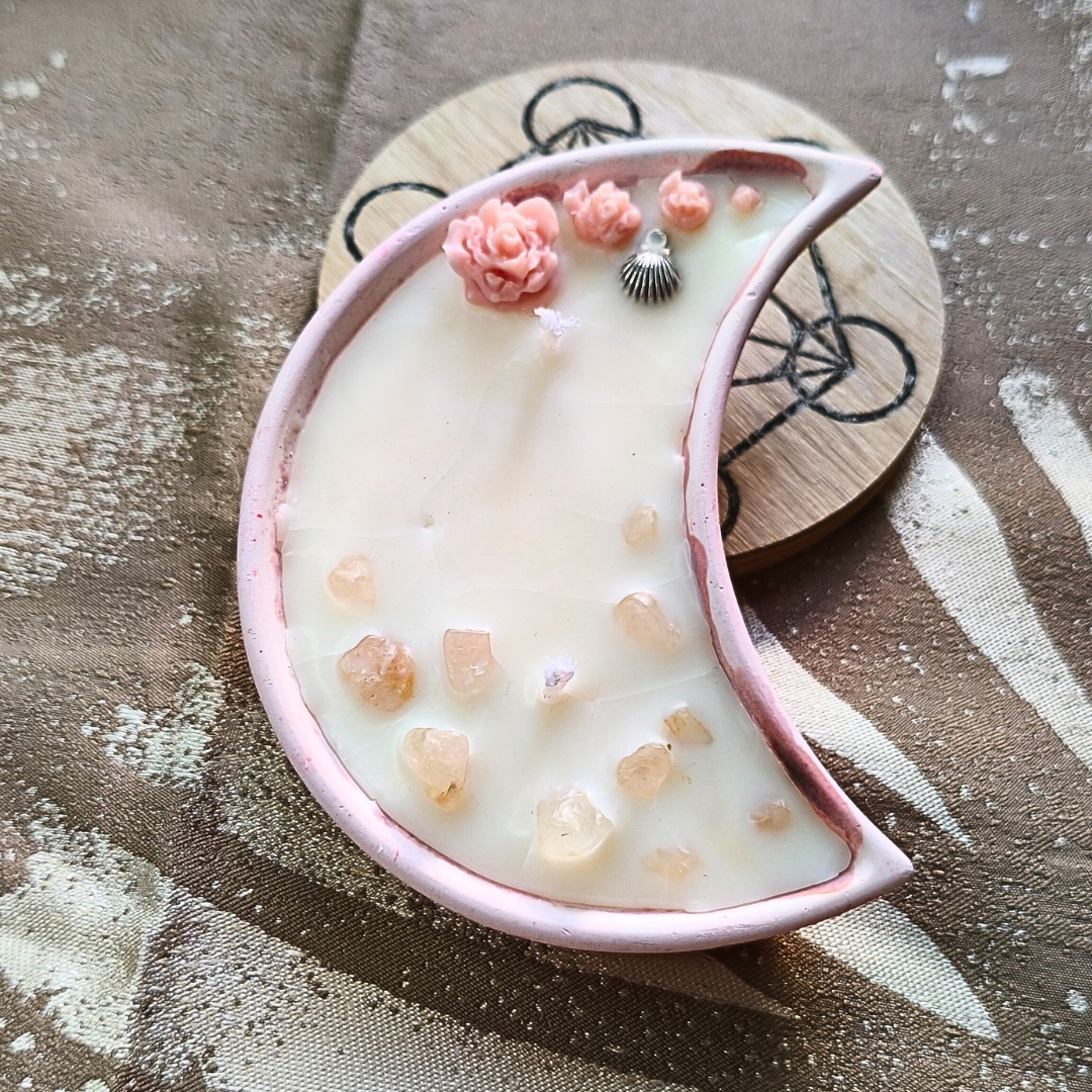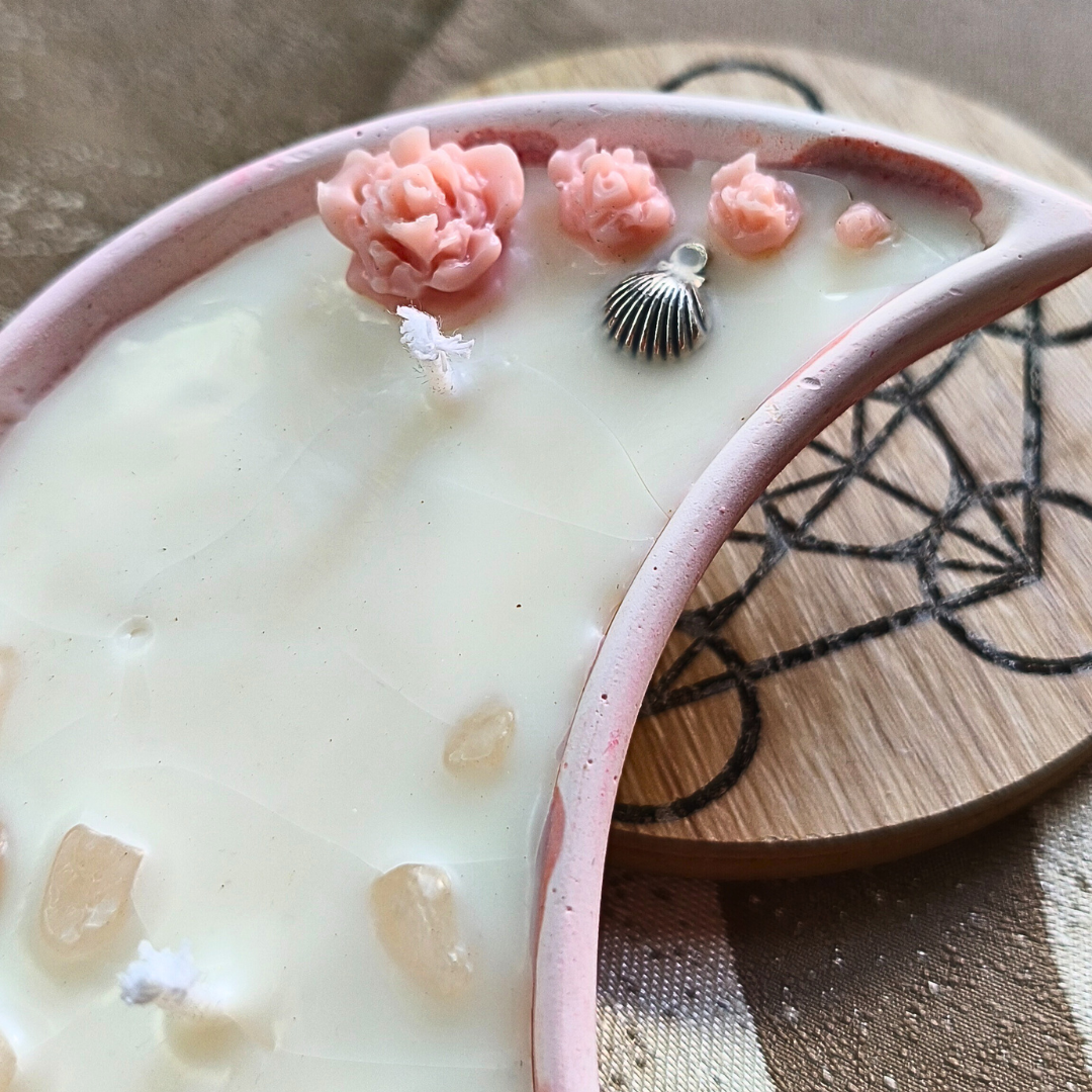 Vela Lua com Óleo Essencial de Palmarosa e Quartzo Rosa