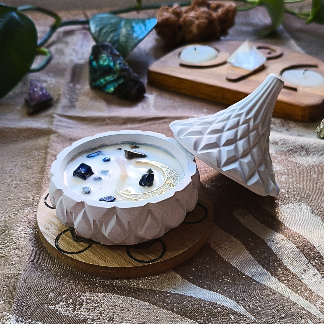 Vela All-Ki-Mística® com Óleo Essencial de Hortelã Pimenta em Tagine com cristais Lápis Lazúli