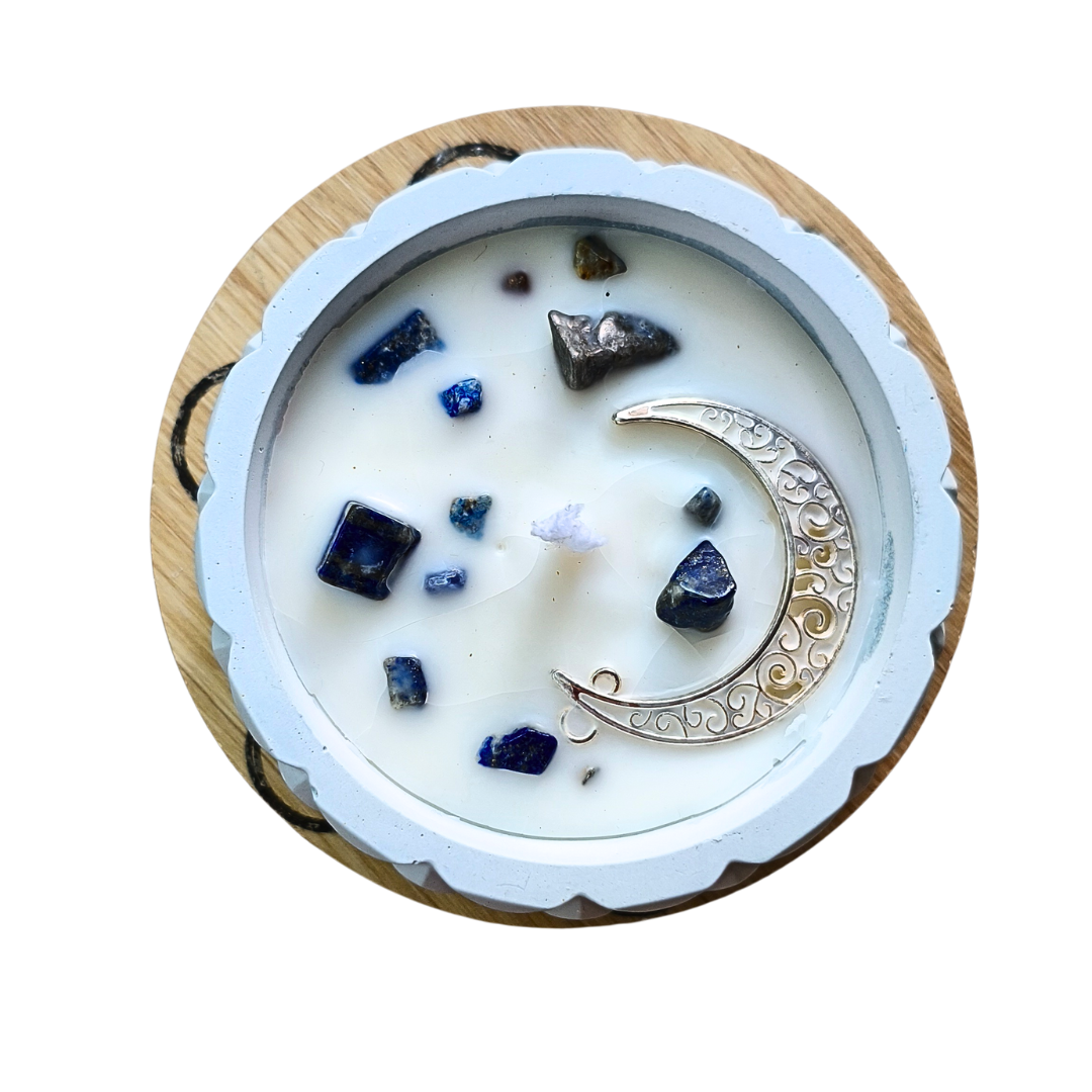 O lápis lazúli é um cristal repleto de história e profundidade. As suas origens remontam ao Antigo Egito, onde era altamente valorizado pela sua bela coloração azul profunda, salpicada de pirita dourada. Ao incorporar o lápis lazúli na decoração das velas, adicionamos um toque de elegância e mistério ao ambiente. Além disso, acredita-se que o lápis-lazúli promove a comunicação clara e a intuição, estimulando o contacto com a espiritualidade, o que o torna perfeito para espaços onde se busca promover a paz e a serenidade.