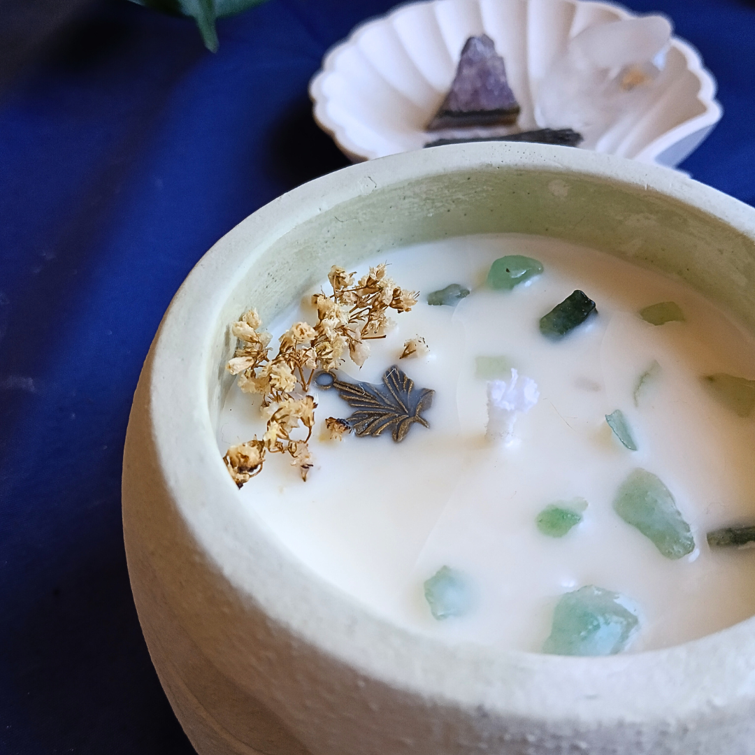 A aventurina verde irradia uma energia calmante e revitalizante. Originária principalmente da Índia, é conhecida pela sua coloração verde suave. Ao decorar as velas com este cristal, adicionamos uma sensação de paz e prosperidade ao ambiente. Acredita-se que a aventurina verde promove o equilíbrio emocional, saúde e prosperidade, tornando-a a escolha ideal para espaços onde se busca promover a harmonia e o bem-estar.