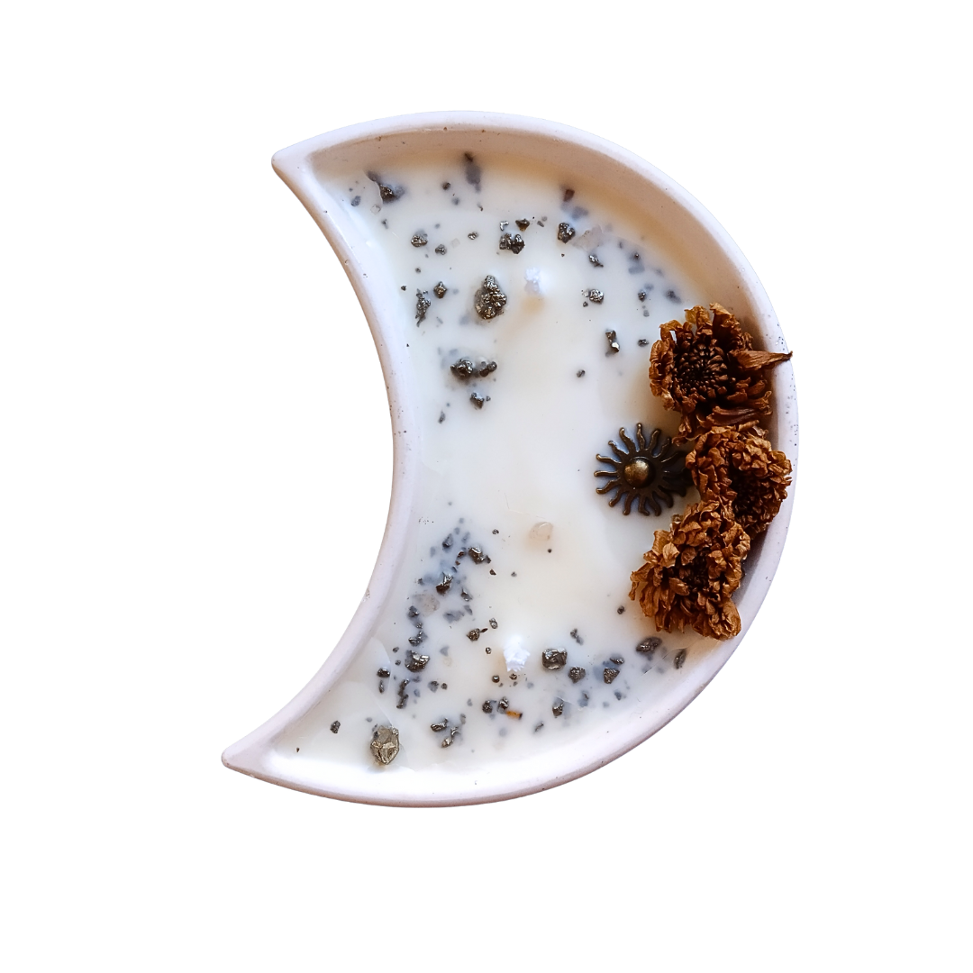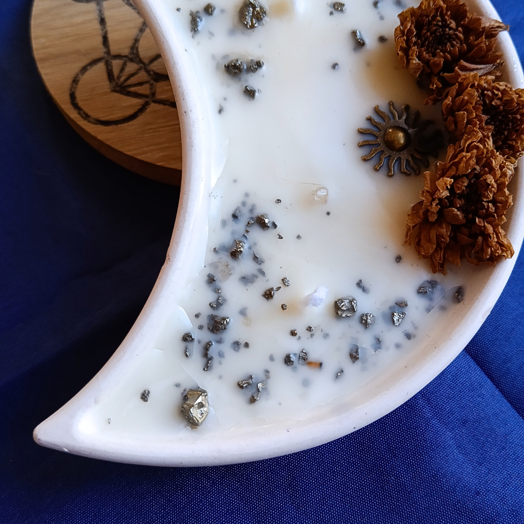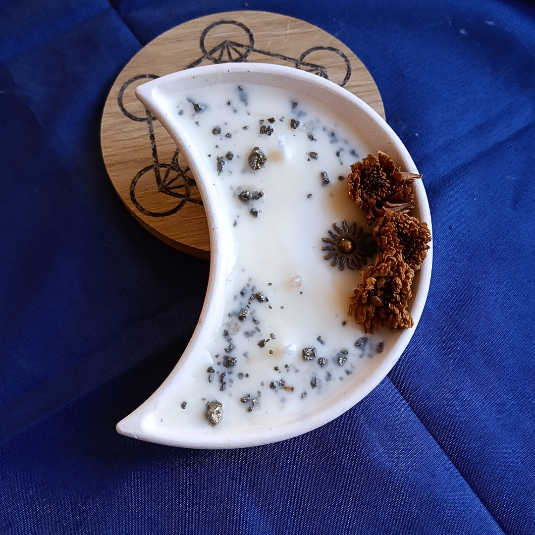 Vela All-Ki-Mística® com Óleo Essencial de Limão em Lua com cristais Pirite
